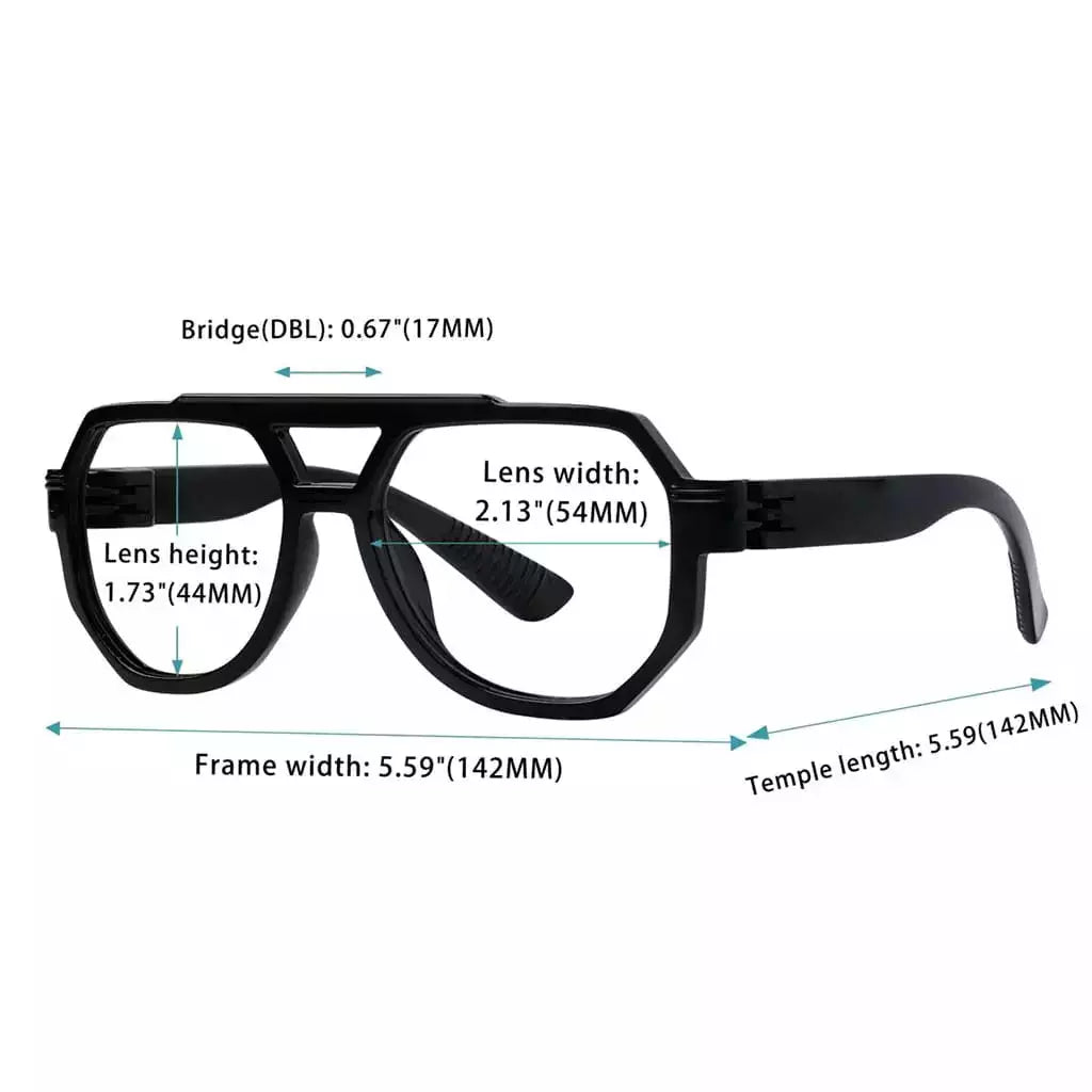 • Frame width: 5.59 inches (142mm), Lens width: 2.13 inches (54mm), Lens height: 1.73 inches (44mm), Bridge width: 0.67 inches (17mm), Temple length: 5.59 inches (142mm)