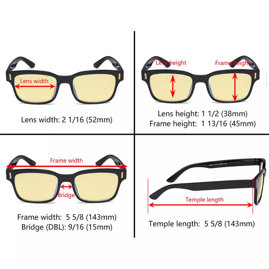 • Frame width: 5.63 inches (143mm), Lens width: 2.05 inches (52mm), Lens height: 1.50 inches (38mm), Bridge width: 0.59 inches (15mm), Temple length: 5.63 inches (143mm)