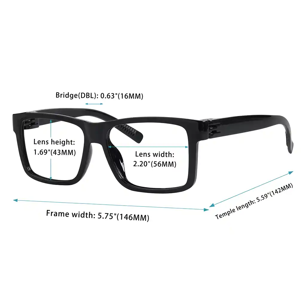 • Frame width about 5.75 inches (146mm), Lens width about 2.20 inches (56mm), Lens height about 1.69 inches (43mm), Bridge (DBL) about 0.63 inches (16mm), Temple length about 5.59 inches (142mm).