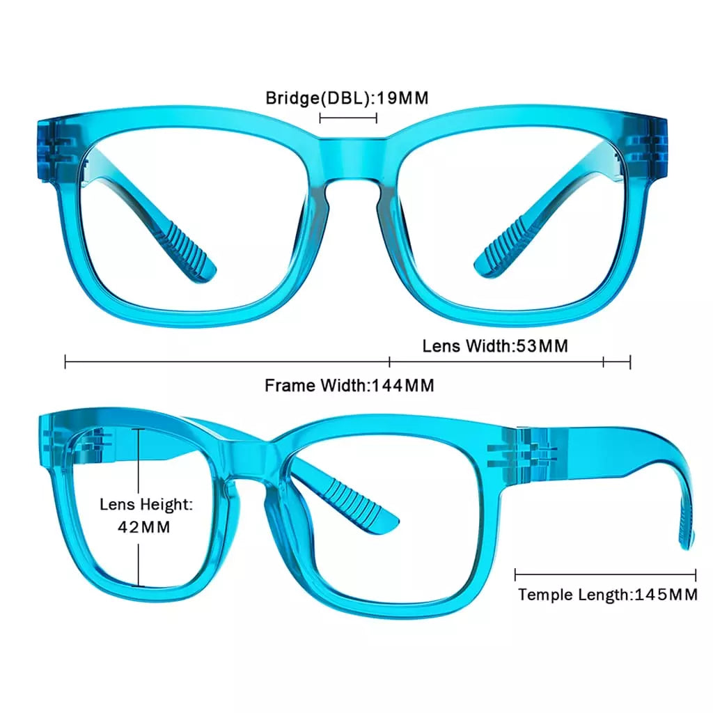 Frame width: 5.67 inches (144mm), Lens width: 2.09 inches (53mm), Lens height: 1.65 inches (42mm), Bridge width: 0.75 inches (19mm), Temple length: 5.71 inches (145mm)