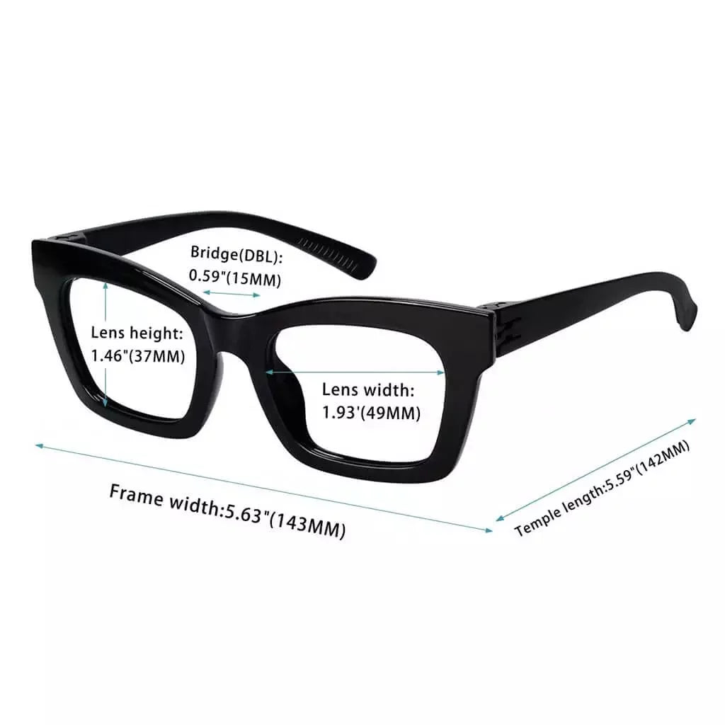 • Frame width about 5.63 inches (143mm), Lens width about 1.93 inches (49mm), Lens height about 1.46 inches (37mm), Bridge (DBL) about 0.59 inches (15mm), Temple length about 5.59 inches (142mm).