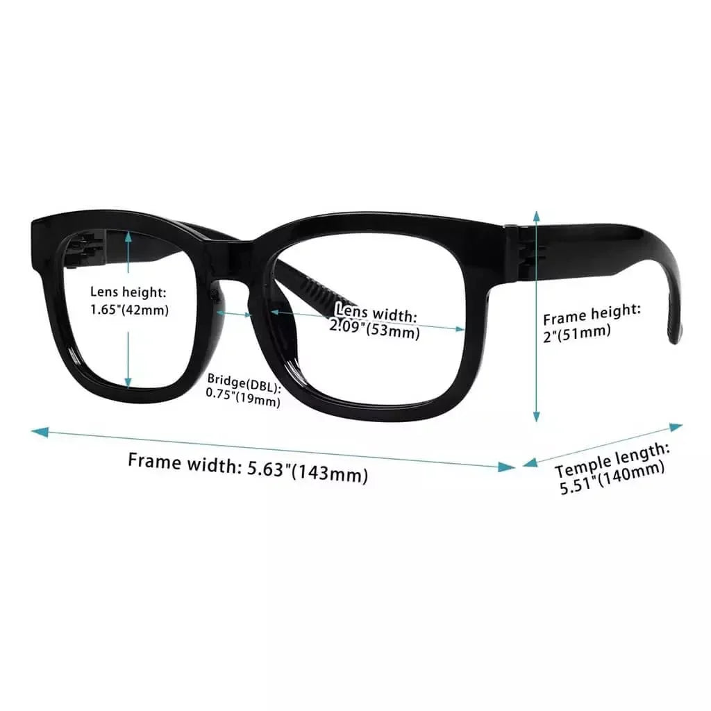 • Frame width: 5.63 inches (143mm), Lens width: 2.09 inches (53mm), Lens height: 1.65 inches (42mm), Bridge width: 0.75 inches (19mm), Temple length: 5.51 inches (140mm)