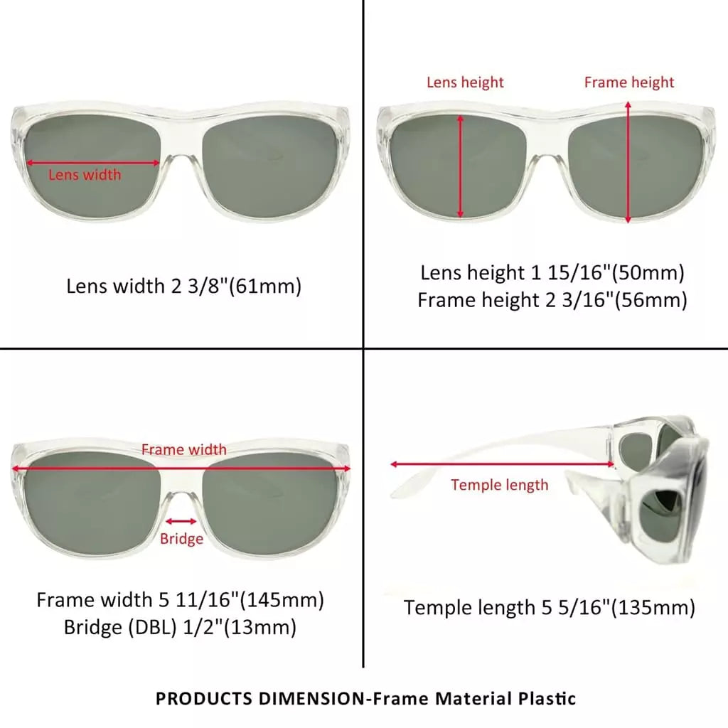 • Frame width: 5.71 inches (145mm), Lens width: 2.40 inches (61mm), Lens height: 1.97 inches (50mm), Bridge (DBL): 0.51 inches (13mm), Temple length: 5.31 inches (135mm).