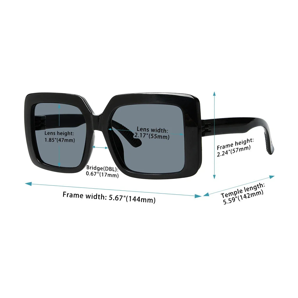 • Frame width: 5.67 inches (144mm), Lens width: 2.17 inches (55mm), Lens height: 1.85 inches (47mm), Bridge width: 0.67 inches (17mm), Temple length: 5.59 inches (142mm)