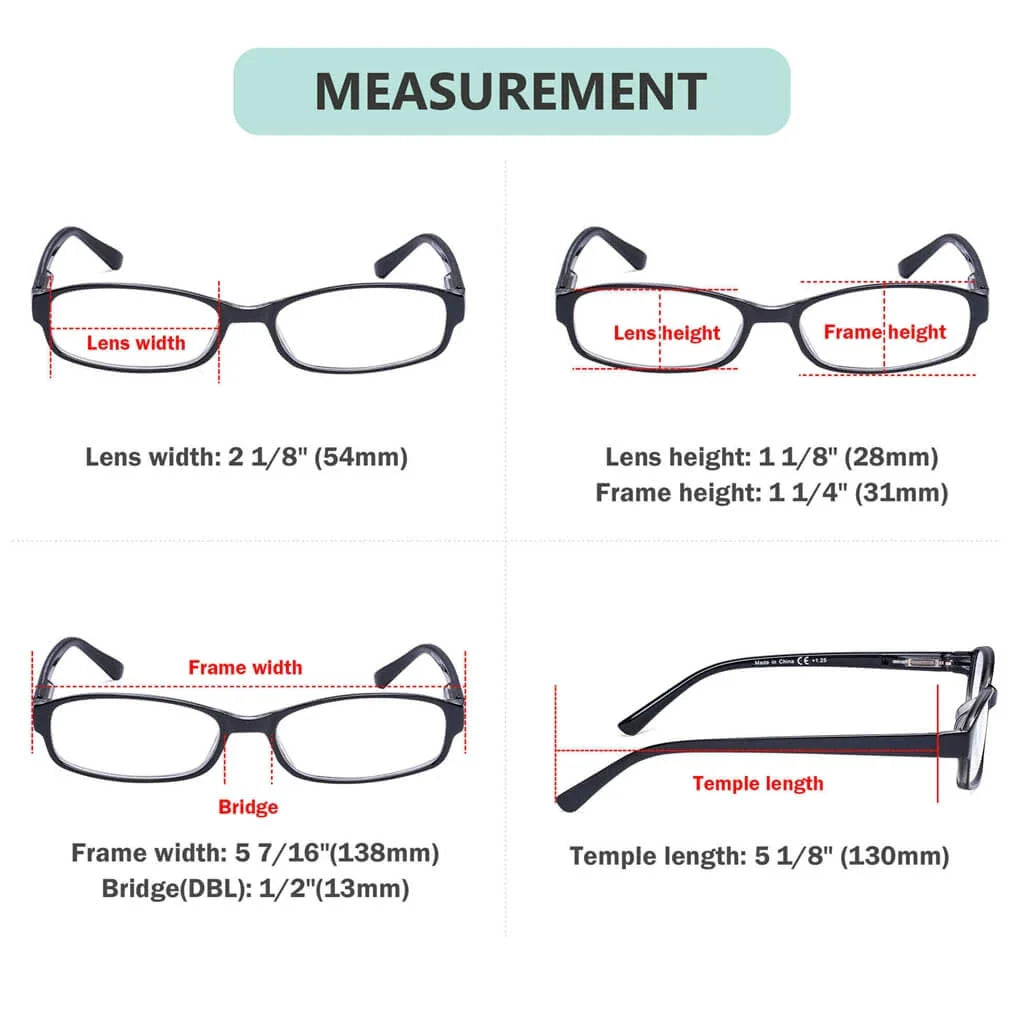 • Frame width: 5.43 inches (138mm), Lens width: 2.13 inches (54mm), Lens height: 1.10 inches (28mm), Bridge width: 0.51 inches (13mm), Temple length: 5.12 inches (130mm)