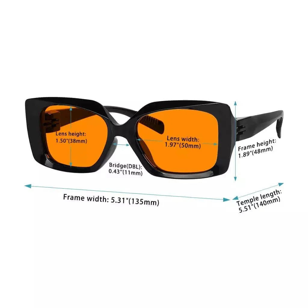 • Frame width: 5.31 inches (135mm), Lens width: 1.97 inches (50mm), Lens height: 1.50 inches (38mm), Bridge width: 0.43 inches (11mm), Temple length: 5.51 inches (140mm)