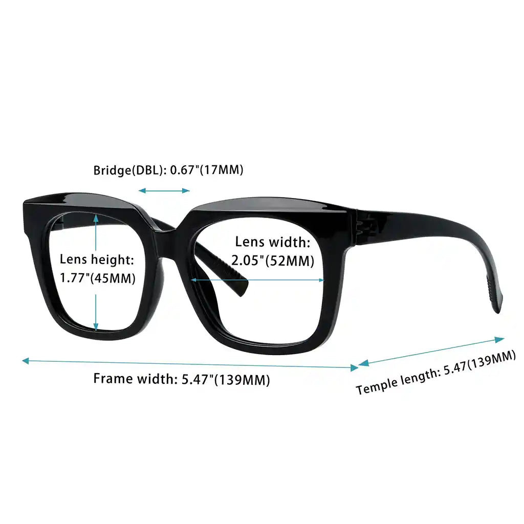 • Frame width:5.47 inches (139mm), Lens width:2.05 inches (52mm), Lens height:1.77 inches (45mm), Bridge (DBL):0.67 inches (17mm), Temple length:5.47 inches (139mm).