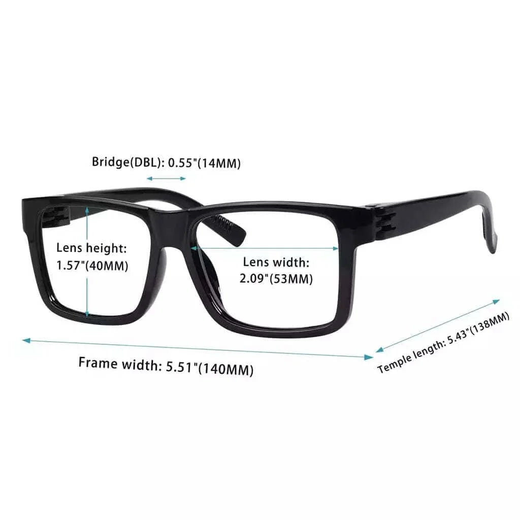 • Frame width: 5.51 inches (140mm), Lens width: 2.09 inches (53mm), Lens height: 1.57 inches (40mm), Bridge width: 0.55 inches (14mm), Temple length: 5.43 inches (138mm)
