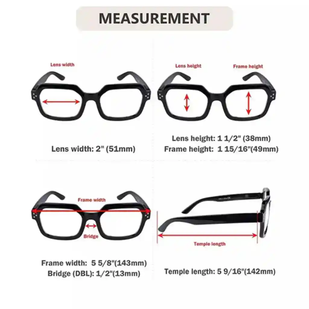 • Frame width:5.63 inches (143mm), Lens width:2.01 inches (51mm), Lens height:1.50 inches (38mm), Bridge(DBL):0.51 inches (13mm), Temple length:5.59 inches (142mm).