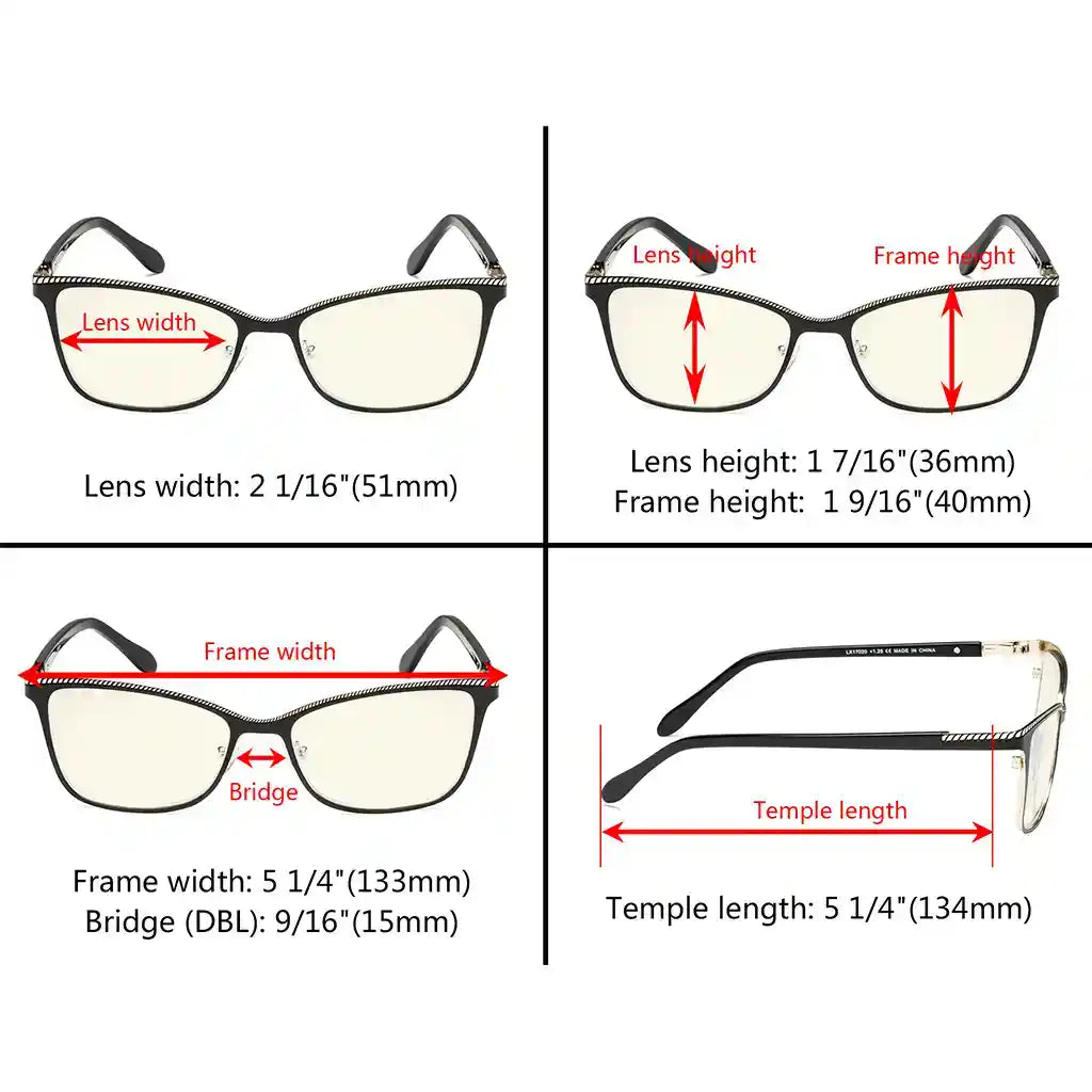 • Frame width: 5.24 inches (133mm), Lens width: 2.01 inches (51mm), Lens height:1.42 inches (36mm), Bridge(DBL): 0.59 inches (15mm), Temple length: 5.28 inches (134mm).