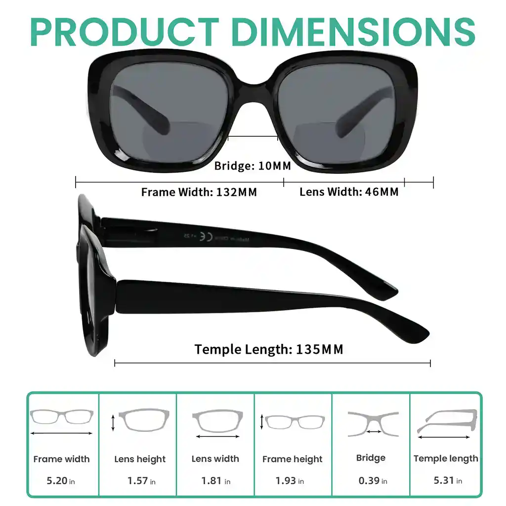 • Frame width:5.20 inches (132mm), Lens width:1.81 inches (46mm), Lens height:1.57 inches (40mm), Bridge (DBL):0.39 inches (10mm), Temple length:5.31 inches (135mm).
