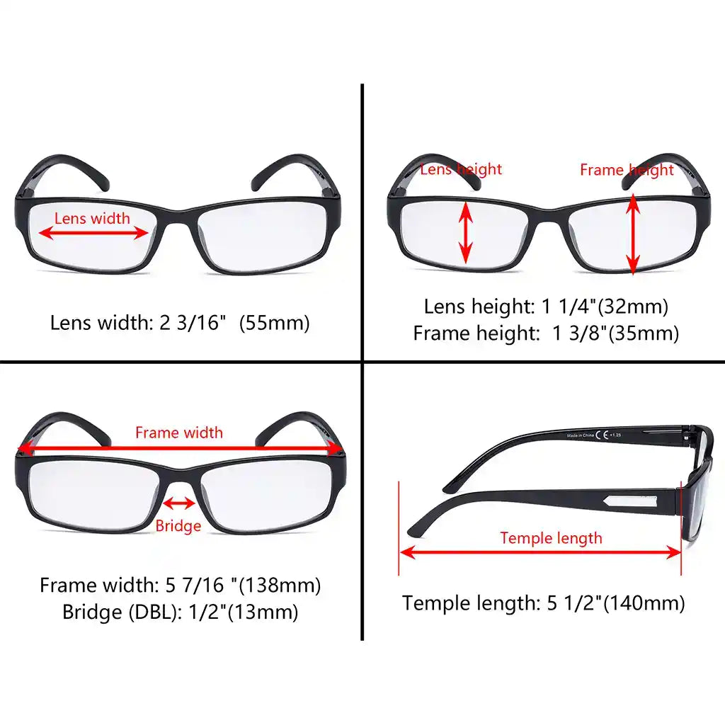• Frame width:5.43 inches (138mm), Lens width:2.17 inches(55mm), Lens height:1.26 inches(32mm), Bridge(DBL): 0.51 inches(13mm), Temple length:5.51 inches(140mm).