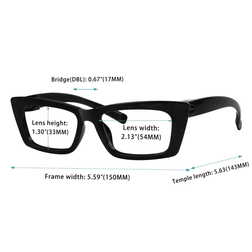 • Frame width: 5.59 inches (150mm), Lens width: 2.13 inches (54mm), Lens height: 1.30 inches (33mm), Bridge width: 0.67 inches (17mm), Temple length: 5.63 inches (143mm)