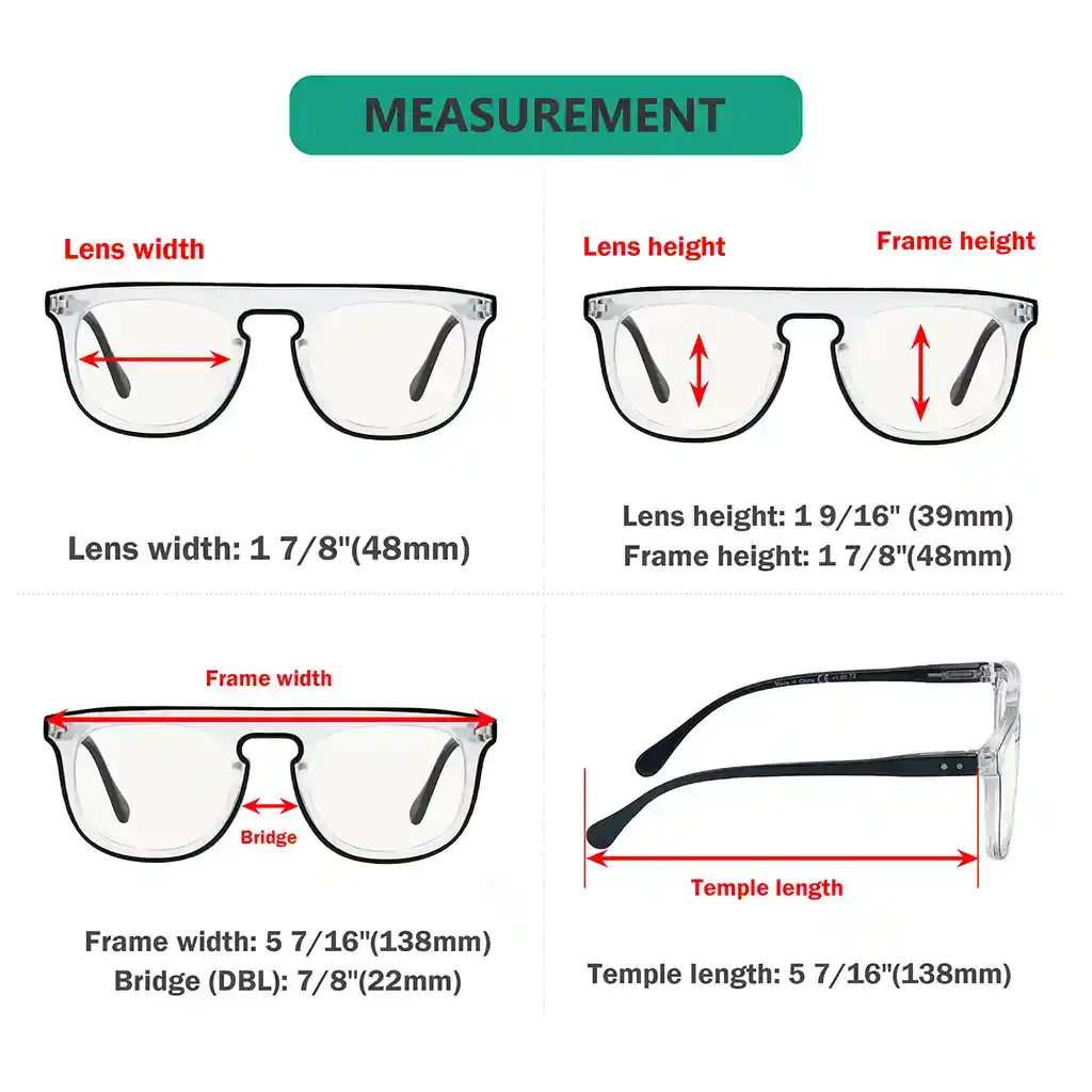 • Frame width: 5.43 inches (138mm), Lens width: 1.89 inches (48mm), Lens height: 1.54 inches (39mm), Bridge(DBL): 0.87 inches (22mm), Temple length:  5.43 inches (138mm).