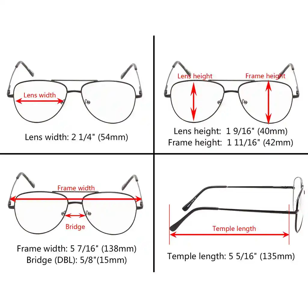 • Frame width: 5.43 inches (138mm), Lens width: 2.13 inches (54mm), Lens height: 1.57 inches (40mm), Bridge (DBL): 0.59 inches (15mm), Temple length: 5.31 inches (135mm).