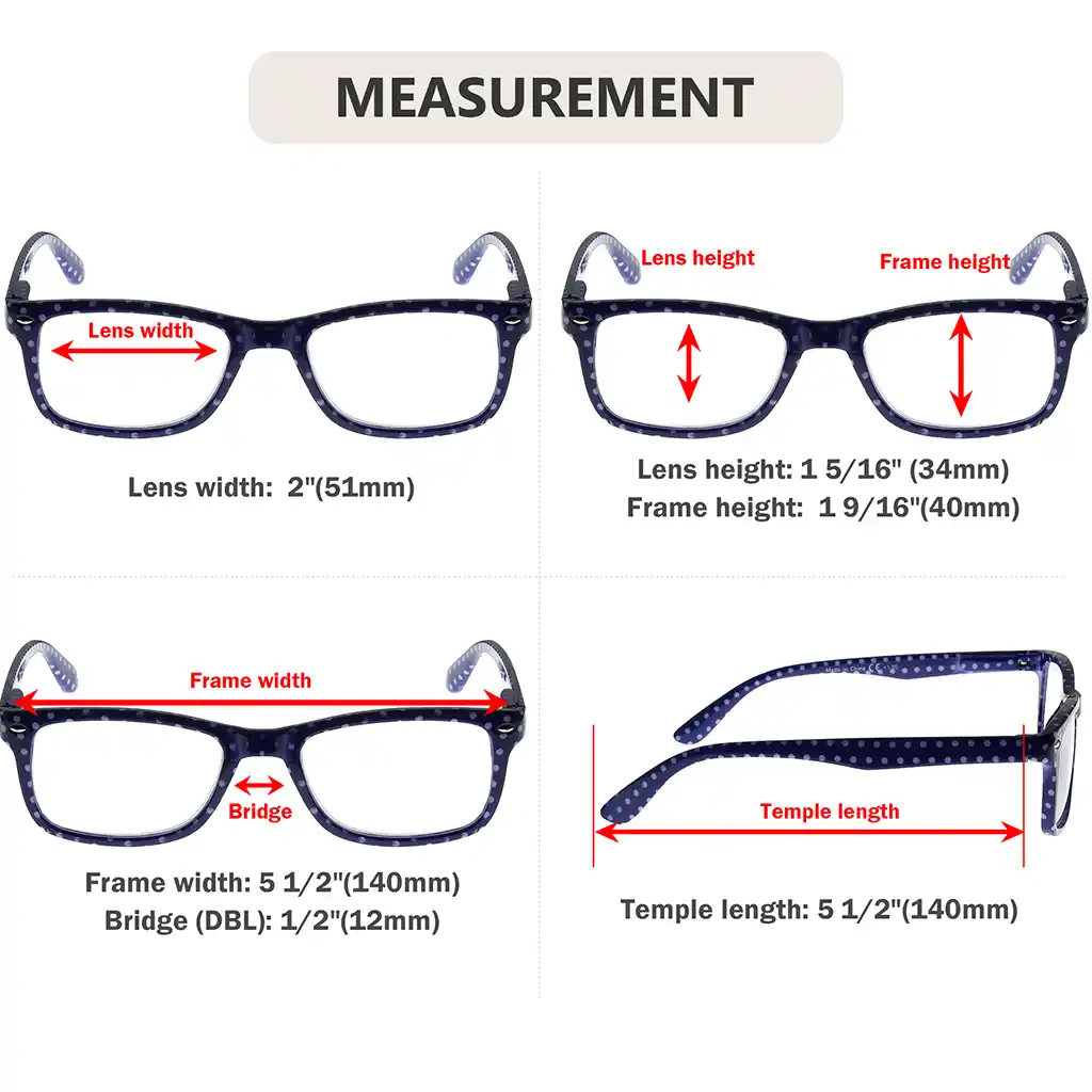 • Frame width: 5.51 inches (140mm), Lens width: 2.01 inches (51mm), Lens height: 1.34 inches (34mm), Bridge(DBL): 0.47 inches (12mm), Temple length: 5.51 inches (140mm).