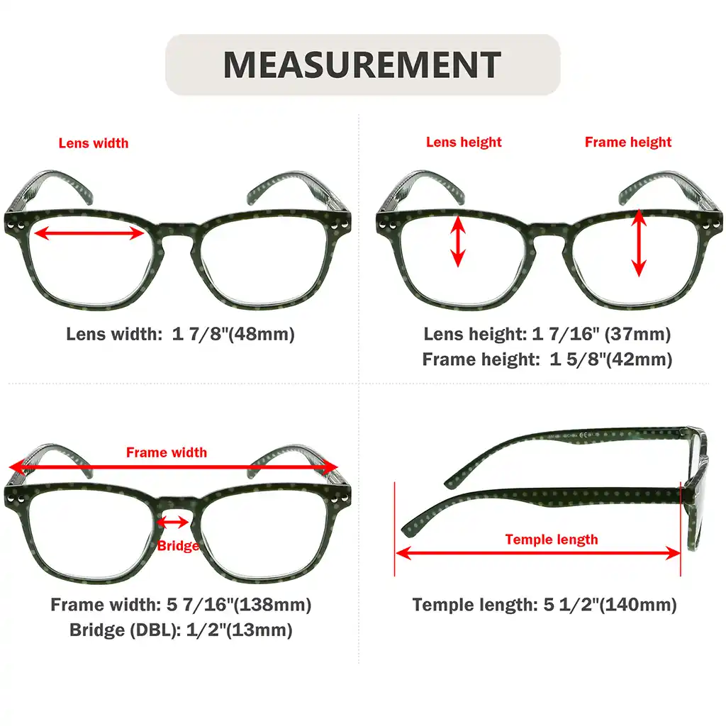 • Frame width: 5.48 inches (138mm), Lens width: 1.89 inches(48mm), Lens height: 1.45 inches(37mm), Bridge(DBL): 0.51 inches(13mm), Temple length: 5.51 inches(140mm).
