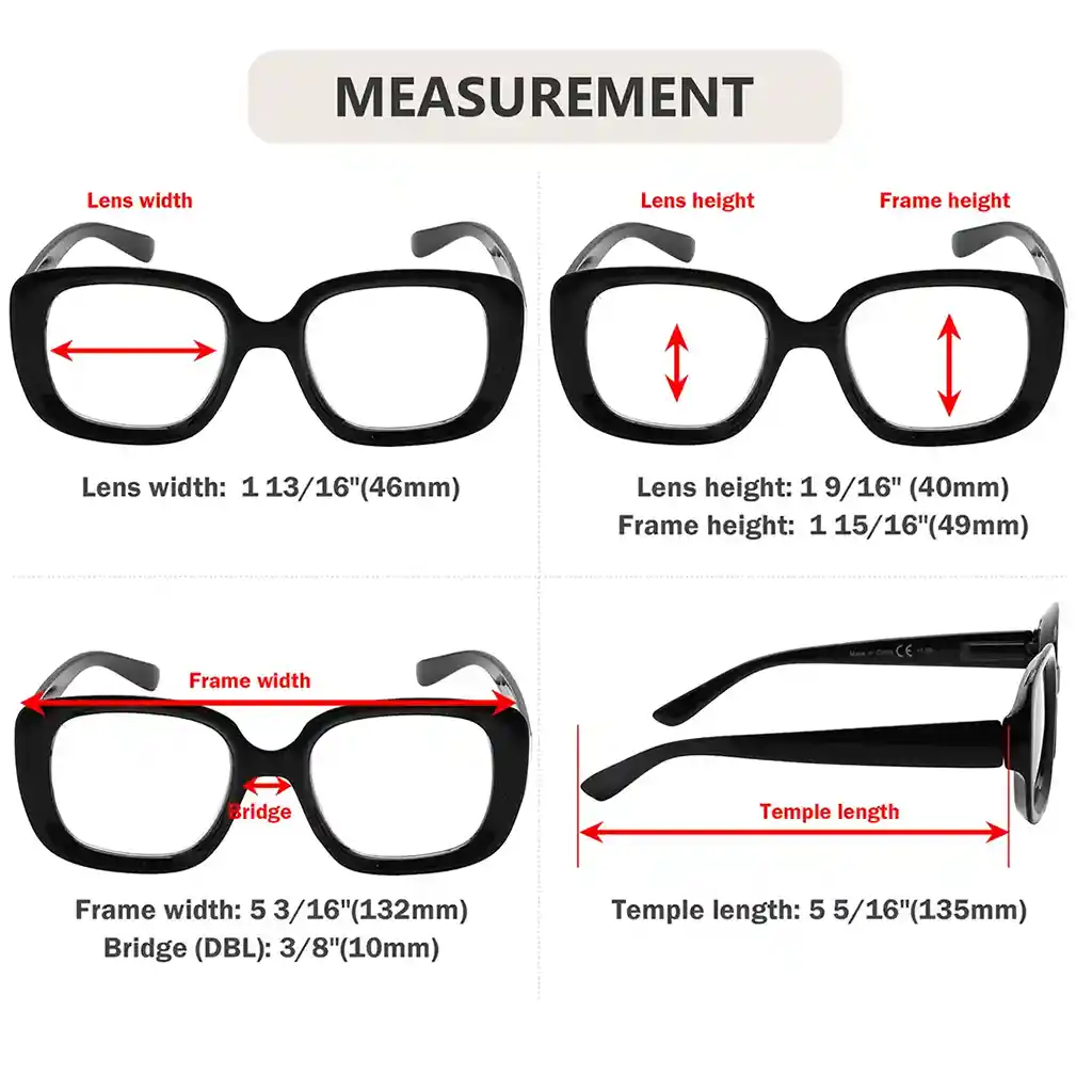 • Frame width:5.20 inches (132mm), Lens width:1.81 inches (46mm), Lens height:1.57 inches (40mm), Bridge(DBL)0.39 inches (10mm), Temple length:5.31 inches (135mm).