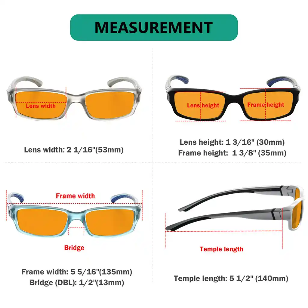 - Frame width:5.31 inches (135mm), Lens width:2.09 inches (53mm), Lens height:1.18 inches (30mm), Bridge (DBL):0.51 inches (13mm), Temple length:5.51 inches (140mm)