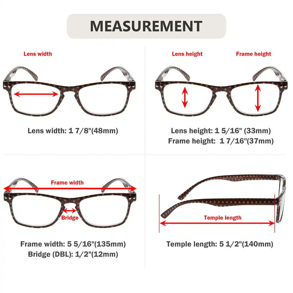 • Frame width: 5.31 inches (135mm), Lens width: 1.89 inches (48mm), Lens height: 1.30 inches (33mm), Bridge(DBL): 0.47 inches (12mm), Temple length: 5.51 inches (140mm).