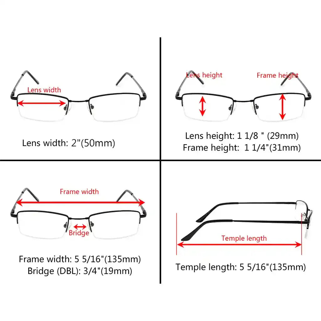 • Frame width:5.31 inches (135mm), Lens width:1.97 inches (50mm), Lens height:1.14 inches (29mm), Bridge (DBL):0.75 inches (19mm), Temple length:5.31 inches (135mm).