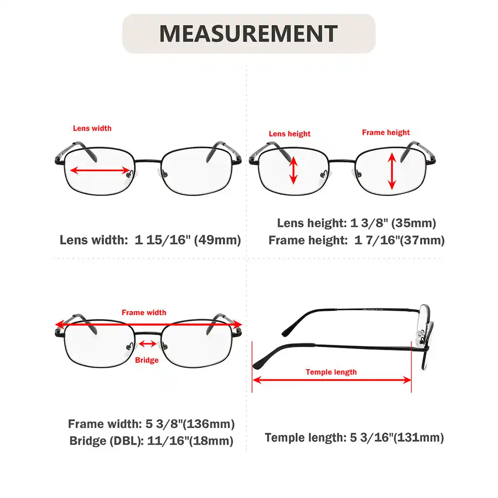 • Frame width about 53/8 inches (136mm), Lens width about 1?15/16?inches (49mm), Lens height about 13/8 inches (35mm), Bridge(DBL) about 11/16 inches (18mm), Temple length about 53/16 inches (131mm)