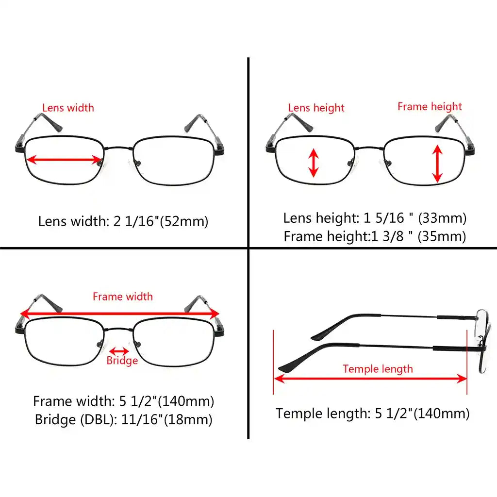 • Frame width: 5.51 inches (140mm), Lens width: 2.05 inches (52mm), Lens height: 1.30 inches (33mm), Bridge (DBL): 0.71 inches (18mm), Temple length: 5.51 inches (140mm).